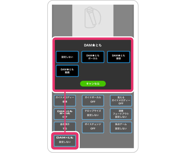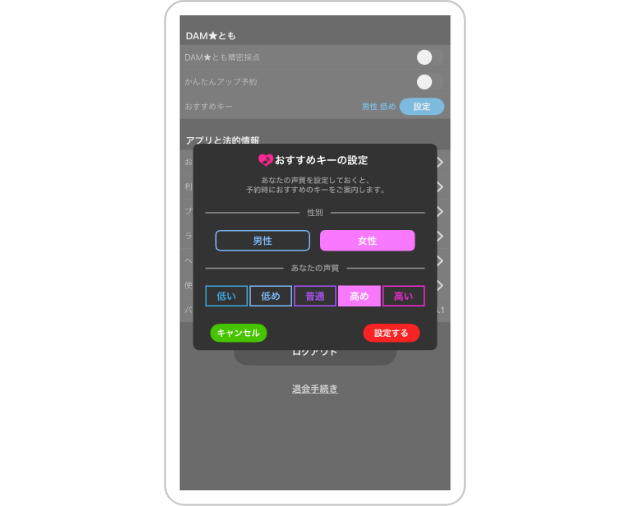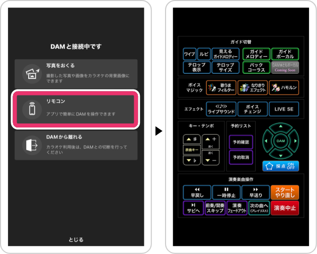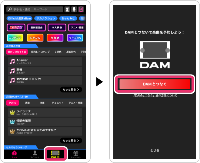 - アプリから楽曲を予約するためには、DAMとの接続が必要です。
