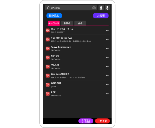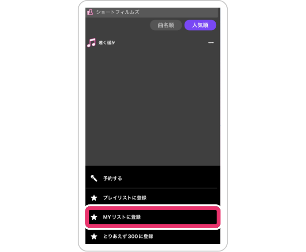 曲名の右にある「…」からは、登録した楽曲の予約や登録・削除も簡単♪ -