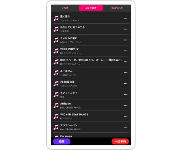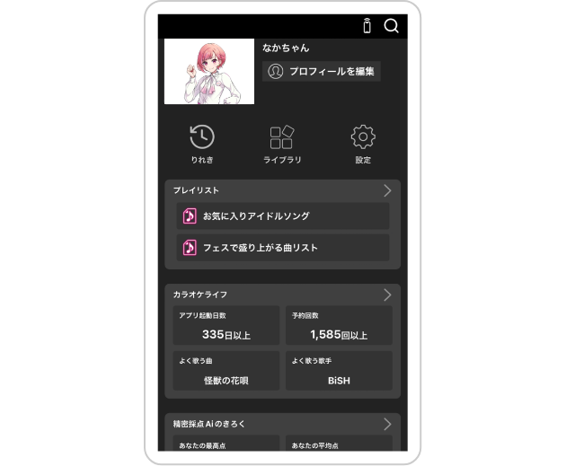 - カラオケ店で歌唱した履歴「MYりれき」や好きな楽曲を登録して楽曲リストを作成する「MYリスト」、遊んだ採点ゲームなどの結果を閲覧できる機能です。