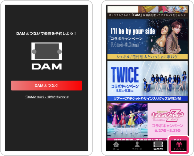 デンモクアプリを開き、下部メニューの「DAM」をクリック。