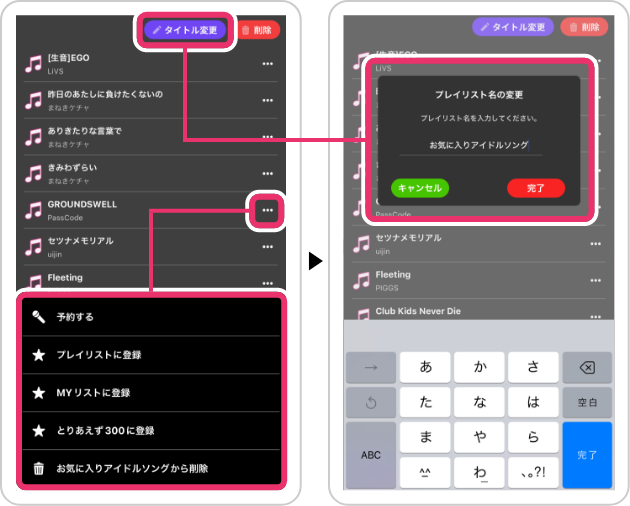 プレイリストのタイトルの変更は、変更したいリスト画面に入り右上の「タイトル変更」ボタンから変更できる!