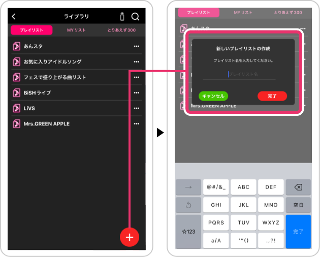 ライブラリ>プレイリスト画面の右下「+」ボタンから作成!